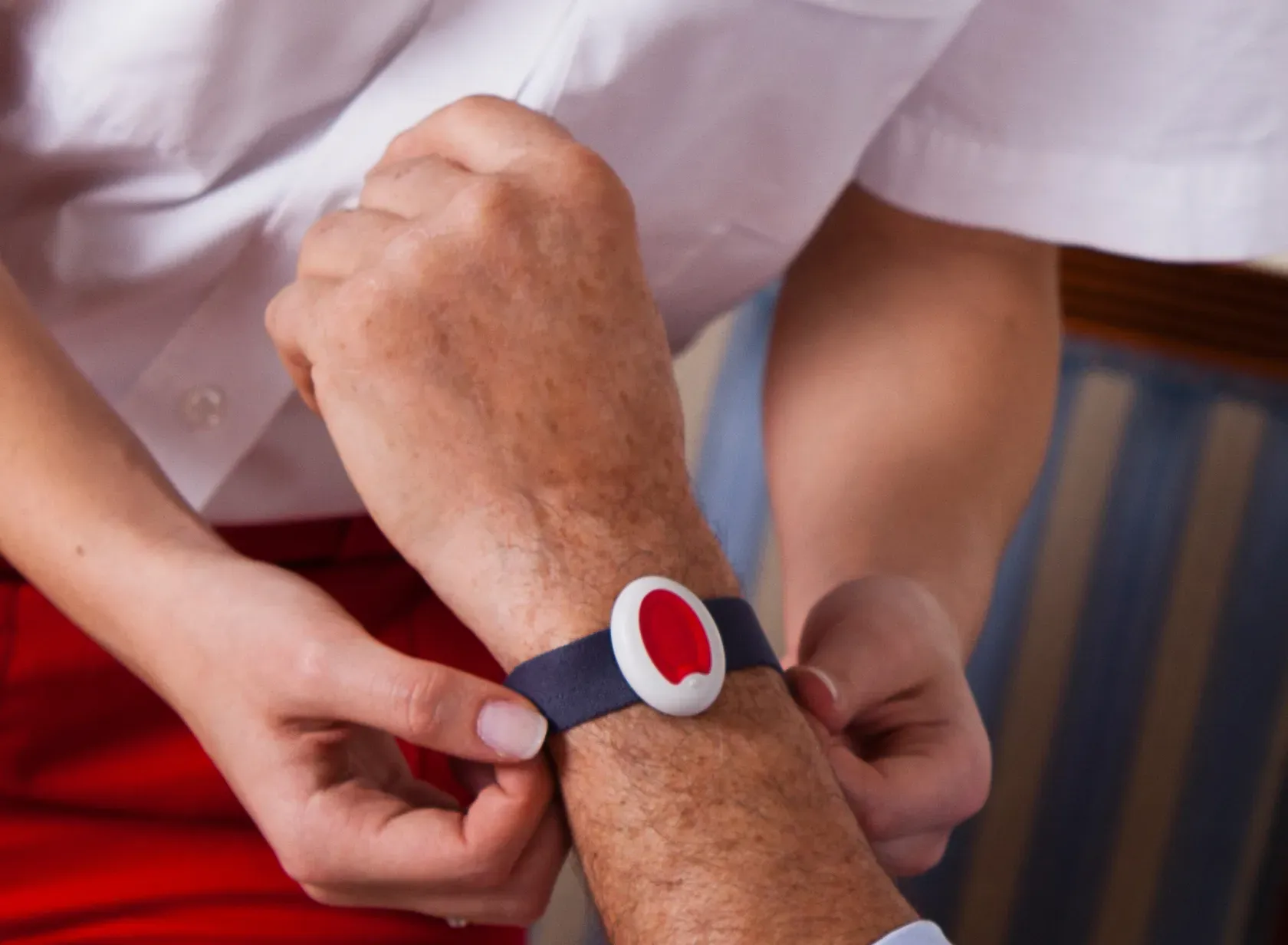 Ein Alarm wird über den Alarmsender ausgelöst, der entweder am Handgelenk oder als Halskette getragen werden kann. Auch eine Alarmauslösung direkt am Gerät ist möglich.